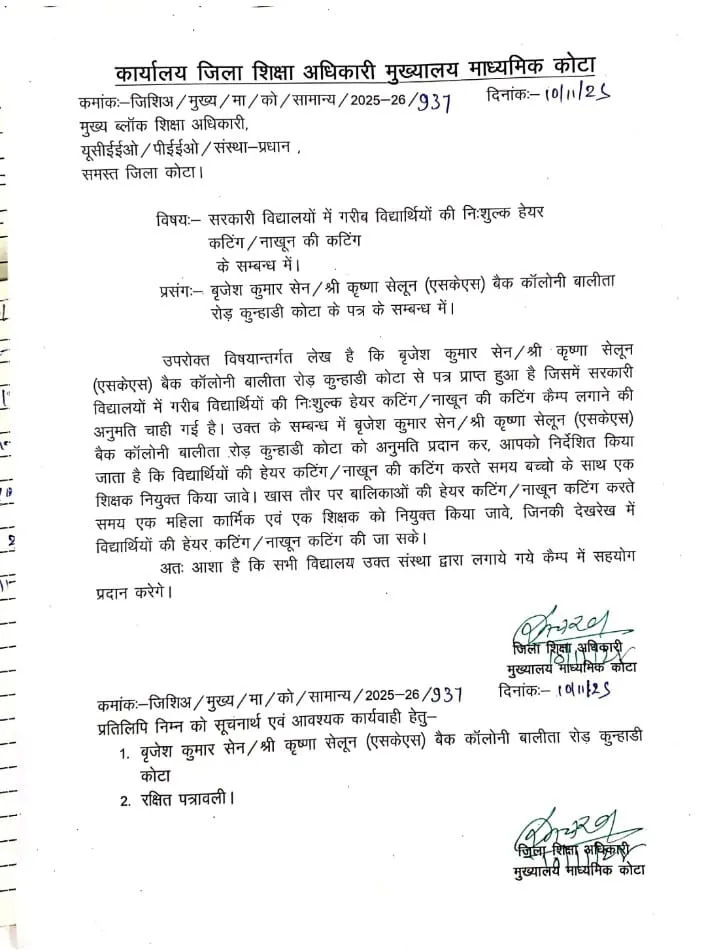रिपोर्ट: Rohtas Darshan चुनाव डेस्क | कोटा | Updated: 11 नवंबर 2025: राजस्थान के कोटा शिक्षा विभाग की ओर से जारी एक अनूठे आदेश ने सोशल मीडिया पर खूब हलचल मचा दी है।