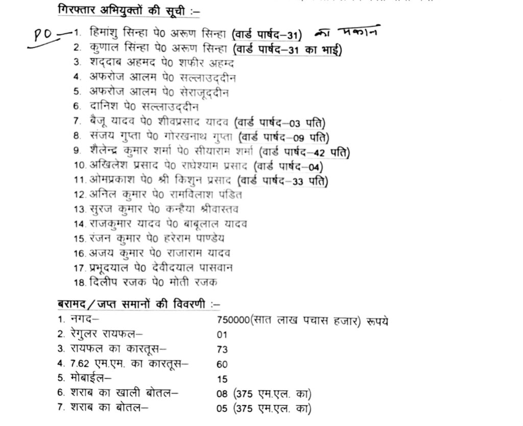 भोजपुर पुलिस की ओर से मिली जानकारी के मुताबिक वार्ड नंबर 31 के पार्षद हिमांशु सिन्हा के आवास पर शराब पार्टी का आयोजन किया गया था। यहां कई लोग शामिल हुए थे। शराब के साथ खाने-पीने की भी पूरी टाईट व्यवस्था कि गई थी। पुलिस ने वार्ड पार्षद हिमांशु के साथ इसके भाई कुणाल सिन्हा को भी गिरफ्तार किया है। ये दोनों अरुण सिन्हा के बेटे हैं। नगर थाना और डीआईयू ने वार्ड नंबर 4 के पार्षद अखिलेश प्रसाद, वार्ड नंबर 3 के पार्षद पति बैजू प्रसाद, वार्ड नंबर 9 के पार्षद पति संजय गुप्ता, वार्ड नंबर 42 के पार्षद पति शैलेन्द्र कुमार शर्मा और वार्ड नंबर 33 के पार्षद पति ओम प्रकाश को गिरफ्तार किया है। पुलिस ने बताया कि इनके पास से एक रायफल, 73 रायफल की गोली, 60 पिस्टल की गोली, 8 शराब की खाली बोतल, 6 विदेशी शराब की बोतल समेत साढ़े सात लाख रुपए बरामद किये हैं। गिरफ्तार सभी लोगों से पूछताछ कर पुलिस आगे की कार्रवाई में जुटी हुई है।