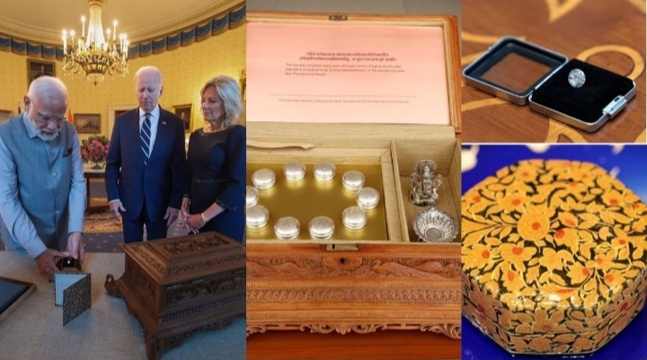 आधिकारिक उपहार के रूप में जो बाइडेन प्रथम महिला जिल बाइडेन पीएम मोदी को 20 वीं सदी की शुरुआत में हस्तनिर्मित प्राचीन अमेरिकी पुस्तक गैली भेंट की। इसके अलावा राष्ट्रपति बाइडेन पीएम मोदी को एक विंटेज अमेरिकी कैमरा भी उपहार में दिया। बाइडेन ने पीएम मोदी को जॉर्ज ईस्टमैन के पहले कोडक कैमरे के पेटेंट की एक अभिलेखीय प्रतिकृति और अमेरिकी वन्यजीव फोटोग्राफी की एक हार्डकवर पुस्तक भी भेंट की है। जिल बाइडेन पीएम मोदी को कलेक्टेड पोयम्स ऑफ रॉबर्ट फ्रॉस्ट की हस्ताक्षरित प्रथम संस्करण प्रति गिफ्ट की।