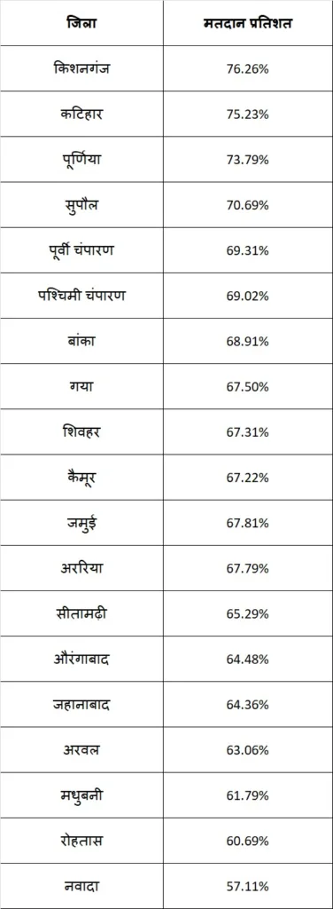 सबसे अधिक मतदान किशनगंज में (76.26%) और सबसे कम नवादा में (57.11%) हुआ।