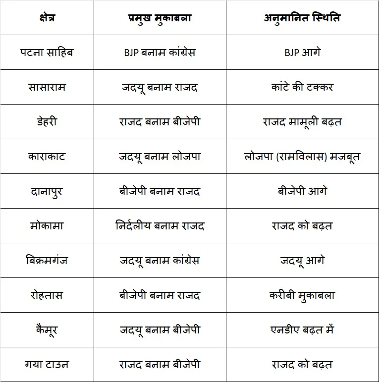 एनडीए को बढ़त मिलती दिख रही है, जबकि महागठबंधन करीबी मुकाबले में है। रोहतास, कैमूर और भोजपुर जैसे दक्षिण-पश्चिम बिहार के जिलों में बीजेपी और जदयू की स्थिति मजबूत मानी जा रही है, वहीं गया, नवादा और जहानाबाद में राजद का प्रभाव कायम बताया जा रहा है।