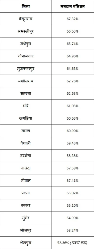 जहां 73.29% वोटिंग दर्ज की गई। वहीं पटना की कुम्हरार सीट पर मात्र 39.52% मतदान हुआ — जो पूरे पहले चरण में सबसे कम रहा।