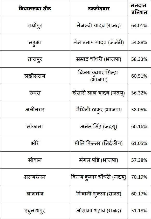 विधानसभा स्तर पर सबसे अधिक मतदान मीनापुर सीट (मुजफ्फरपुर जिला) में हुआ,