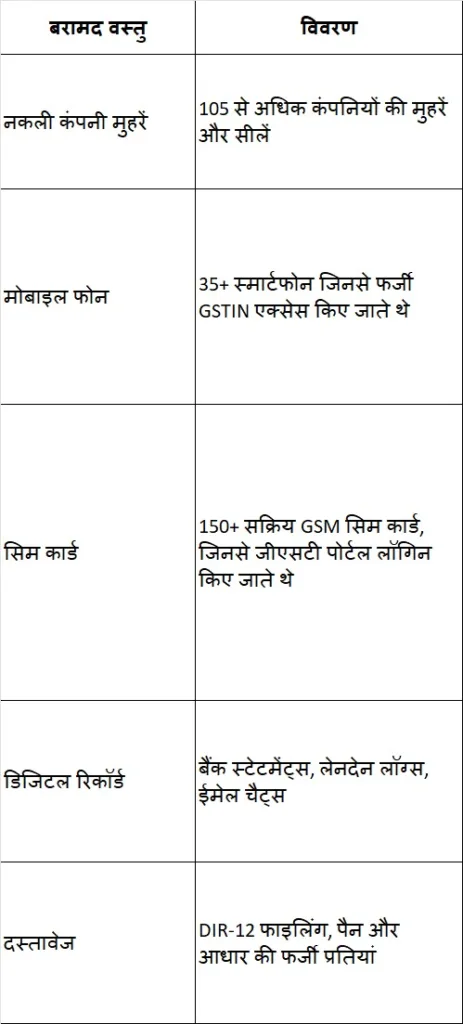 डीजीजीआई की टीम को जांच में कई सिम कार्ड, मोबाइल फोन, डिजिटल रिकॉर्ड, नकली मुहरें, जीएसटी पंजीकरण दस्तावेज़ और बैंक डिटेल्स बरामद हुए हैं।