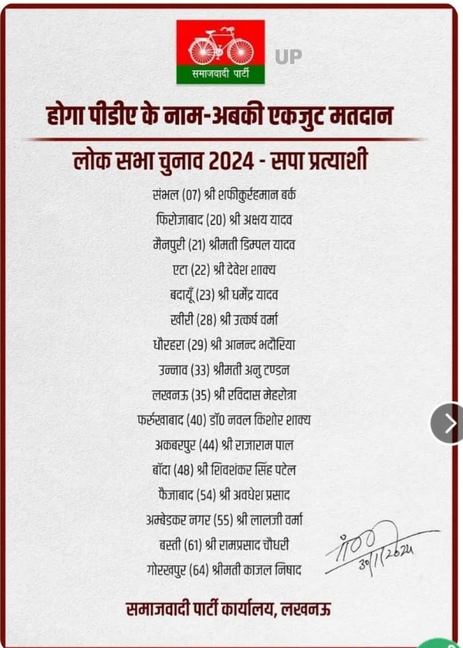 सपा की पहली लिस्ट के मुताबिक संभल से शफीकुरर्हमान बर्क, एटा से देवेश शाक्य, खीरी से उत्कर्ष वर्मा, धौरहरा से आनंद भदौरिया, उन्नाव से अनु टंडन, फर्रुखाबाद से नवल किशोर शाक्य, अकबरपुर से राजा रामपाल, बांदा से शिव शंकर सिंह पटेल, फ़ैज़ाबाद से अवधेश प्रसाद, अंबेडकर नगर से लालजी वर्मा, बस्ती से राम प्रसाद चौधरी और गोरखपुर से काजल निषाद को उम्मीदवार बनाया है।